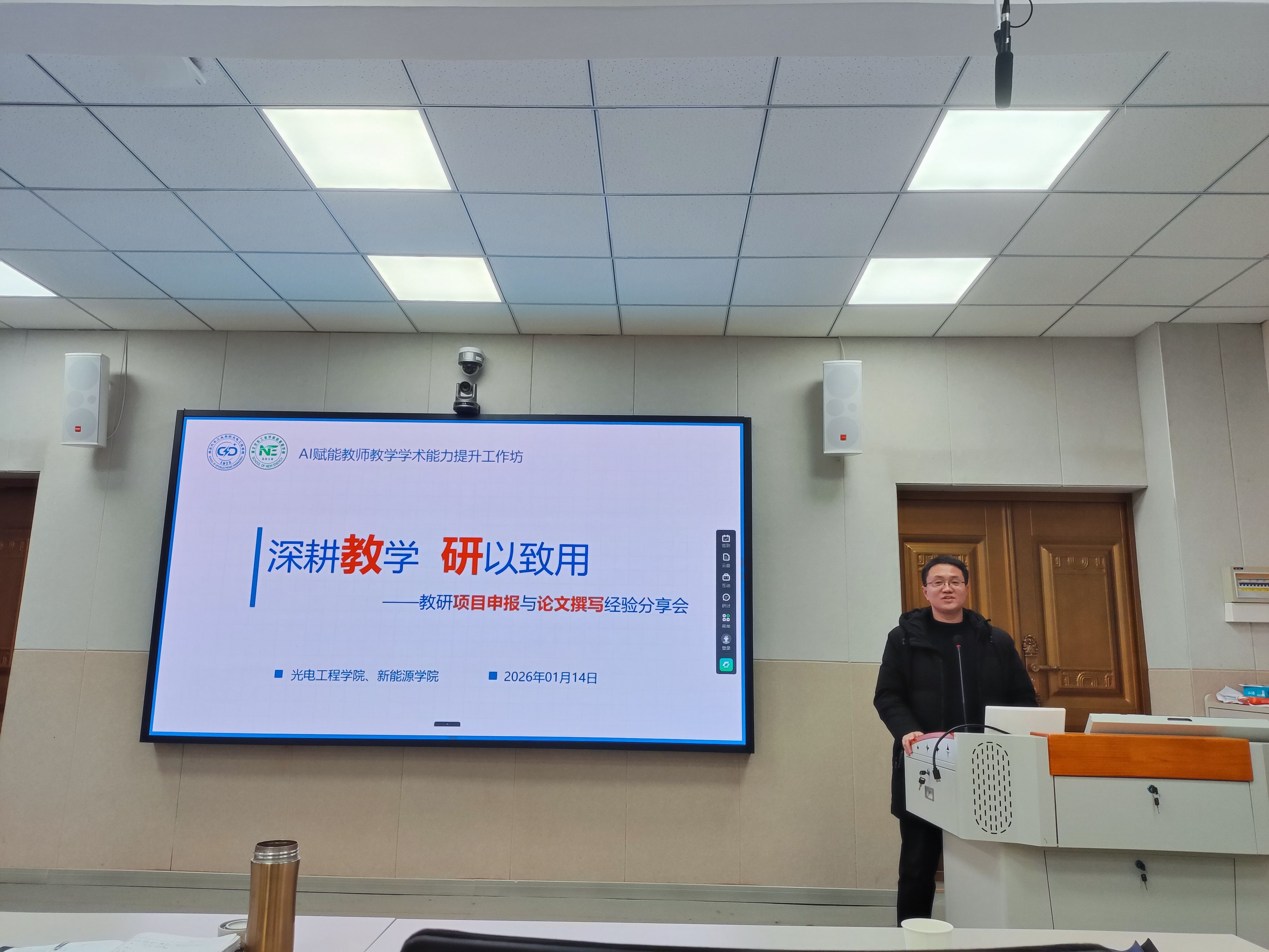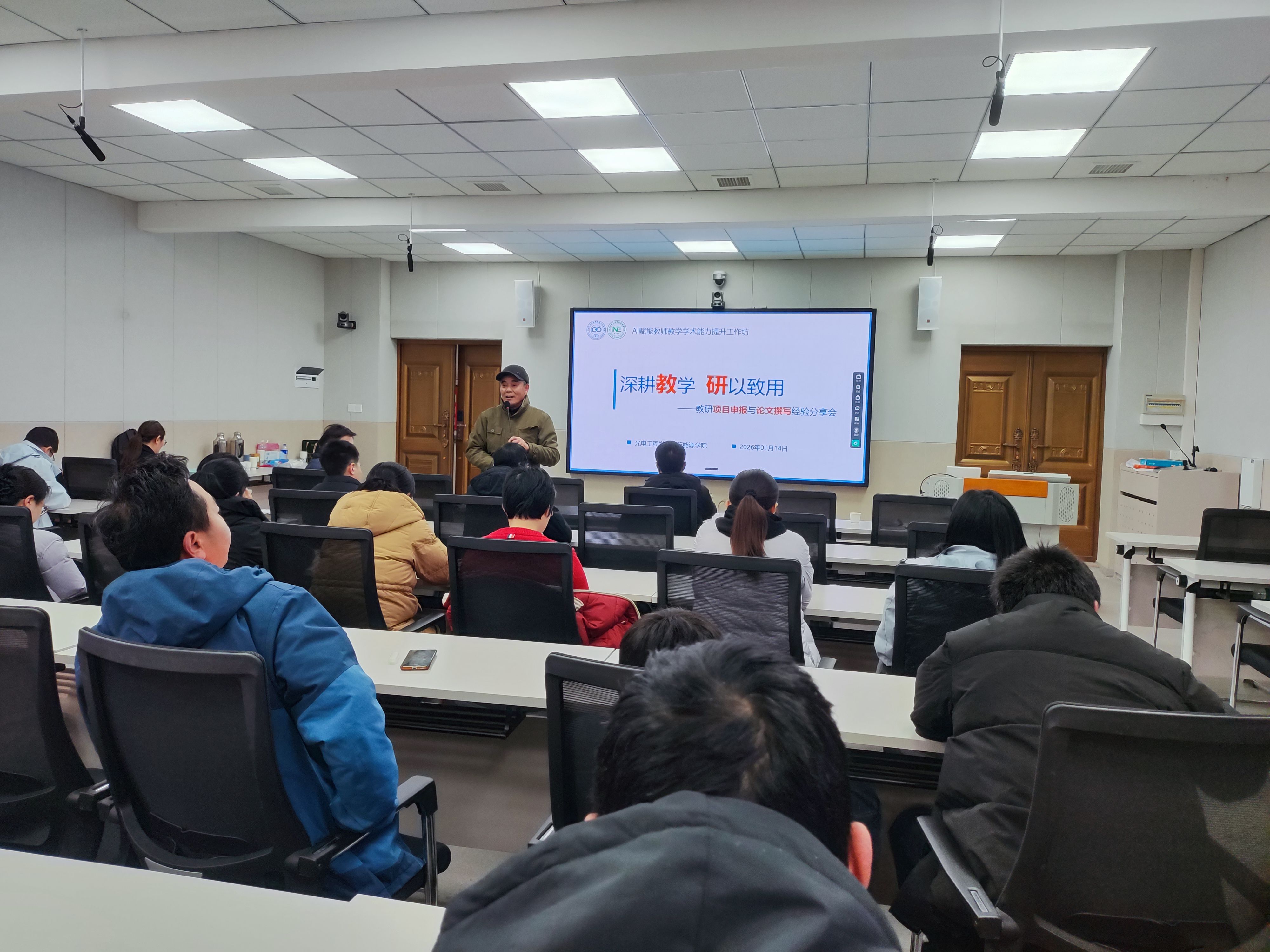 1月14日下午,新能源学院在1303智慧教室成功举办“深耕教学,研以致用”AI赋能教师教学学术能力提升工作坊。活动聚焦教研项目申报与论文撰写,由院长助理曹名磊主持,靳龙、张琴两位老师主讲,校督导组组长毛高波、院长熊永臣及全院专任教师参加。