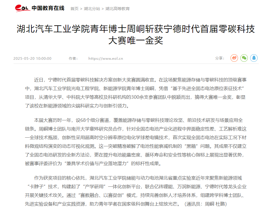 上一条:【湖北日报】湖北汽车工业学院新能源学院青年博士周峒斩获宁德时代首届零碳科技大赛唯一金奖