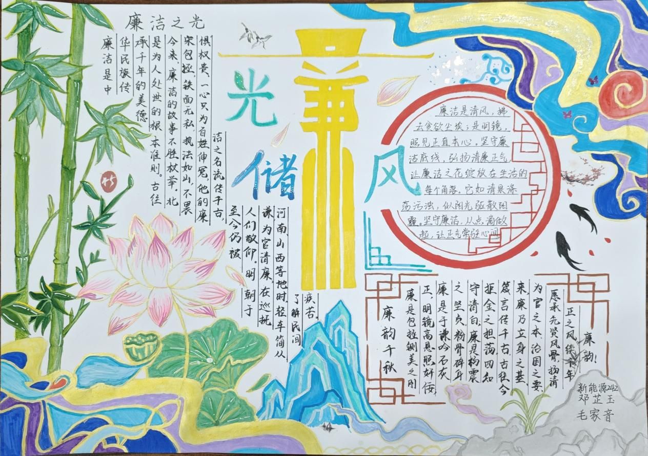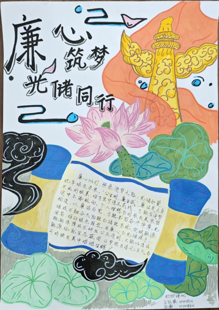 经过评审,手工作品《清正“莲”洁》获得一等奖;烫金画《廉洁》、剪纸《中国“廉”》获得二等奖;手抄报《廉洁》《光储“廉”风》《廉心筑梦,光储同行》获得三等奖,优秀奖若干。