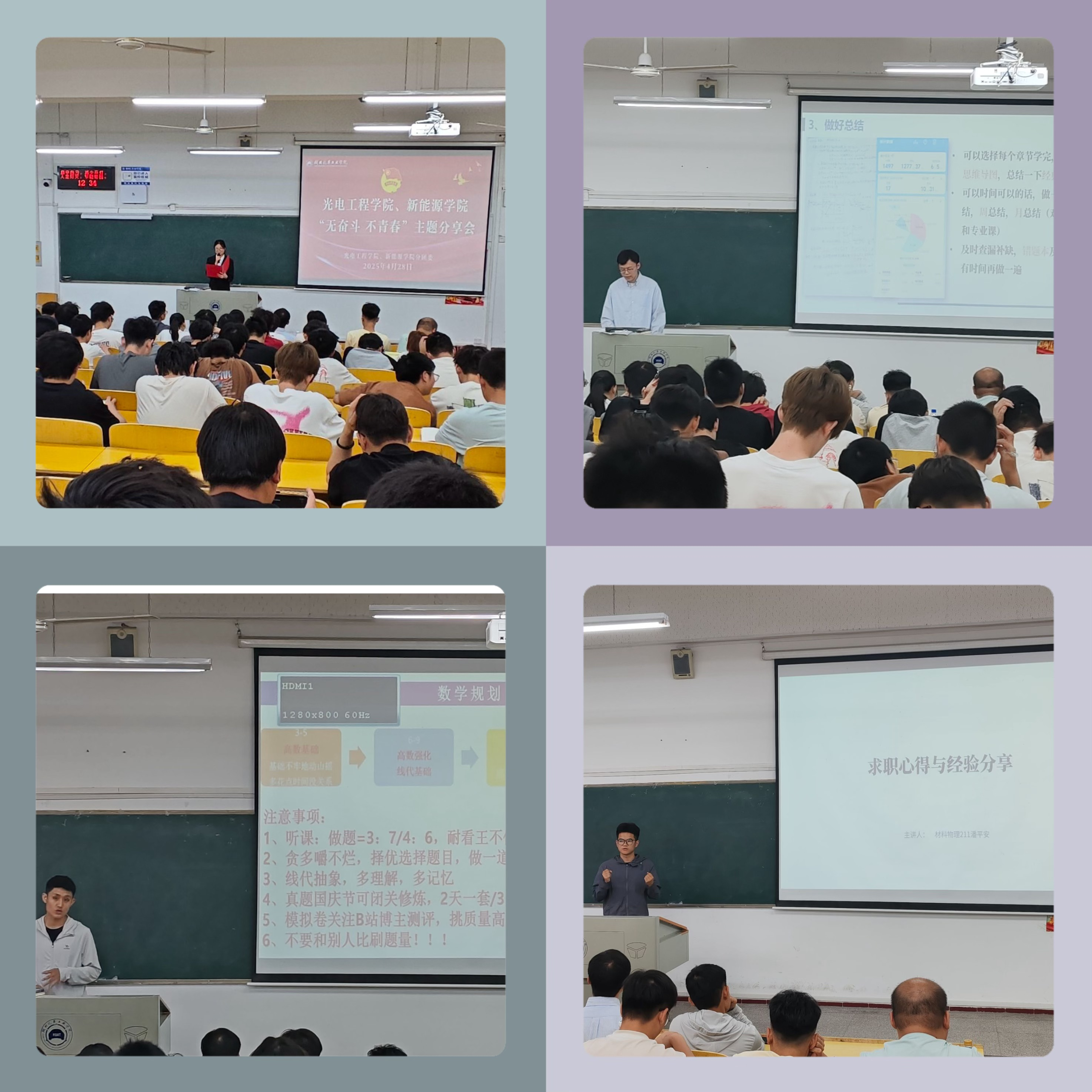 为激发青年学子奋斗热情,引导其明确成长方向,践行青春使命。4月28日,新能源学院在2101教室举行了“无奋斗,不青春”主题故事分享会。本次活动邀请了校友王泽琛、优秀毕业生李鹏杰、朱永亮、就业先锋潘平安四位嘉宾,围绕大学生活规划、考研、就业等主题展开分享,吸引了一百余名在校生及青马学员参与活动。