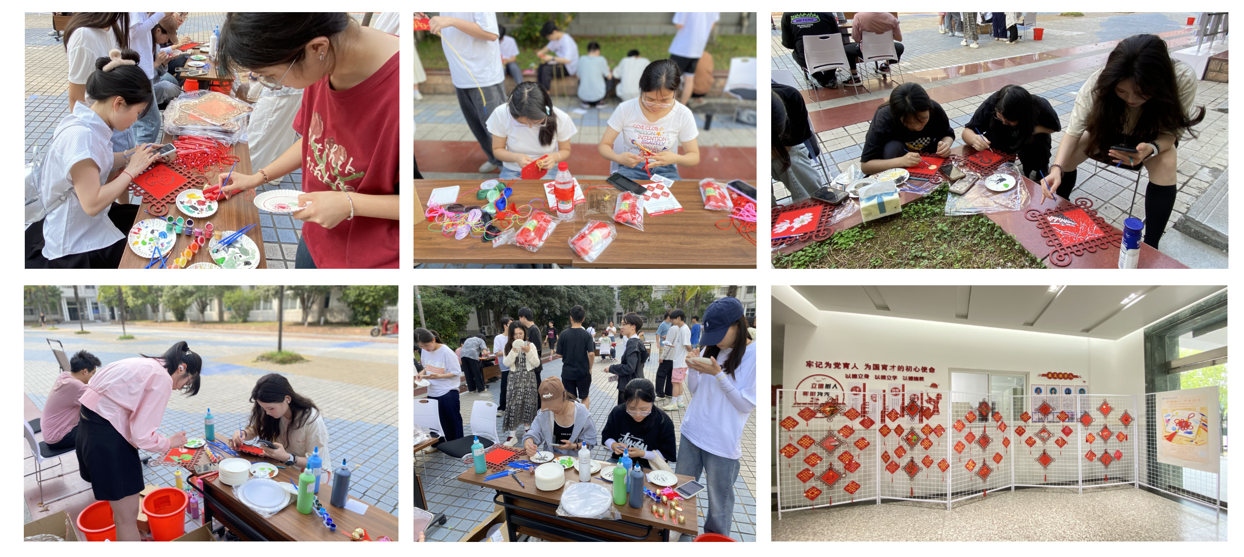 活动现场分为“手作疗愈工坊”、“心语结廊”、“文化科普区”三大特色区域。在“手作疗愈工坊”师生们手持红绳与丝帛,通过专业指导学习平结、吉祥结等编织技法,并在丝带上绘制情绪符号。材料包中的流苏、木珠与彩绘颜料的碰撞,让每位参与者都成为非遗创新表达的创作者,为平时的学业、生活压力找到了出口。“心语结廊”悬挂的中国结与情绪绘画无声地诉说着创作者的心路故事。活动现场特别设置“解忧盲盒”环节,参与者随机领取他人作品,在匿名互动中建立起特殊的情感联结。“文化科普区”以“非遗知多少”趣味问答掀起热潮,通过介绍讲解中国结的千年演变,同时穿插呼吸调节、正念冥想等心理知识科普。活动特别设计的组队机制要求跨专业团队协作完成作品,让参与的同学结交了跨学科的友谊。