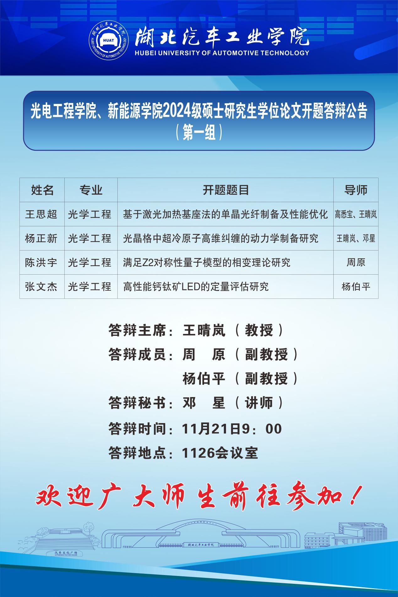 根据国务院学位委员会、教育部《关于进一步严格规范学位与研究生教育质量管理的若干意见》(学位[2020]19号)的要求,以及学校《关于做好2024级硕士研究生学位论文开题工作的通知》要求,结合《湖北汽车工业学院研究生学位论文开题报告管理办法》,现将新能源学院2024级硕士研究生学位论文开题答辩工作安排第一组公告如下: