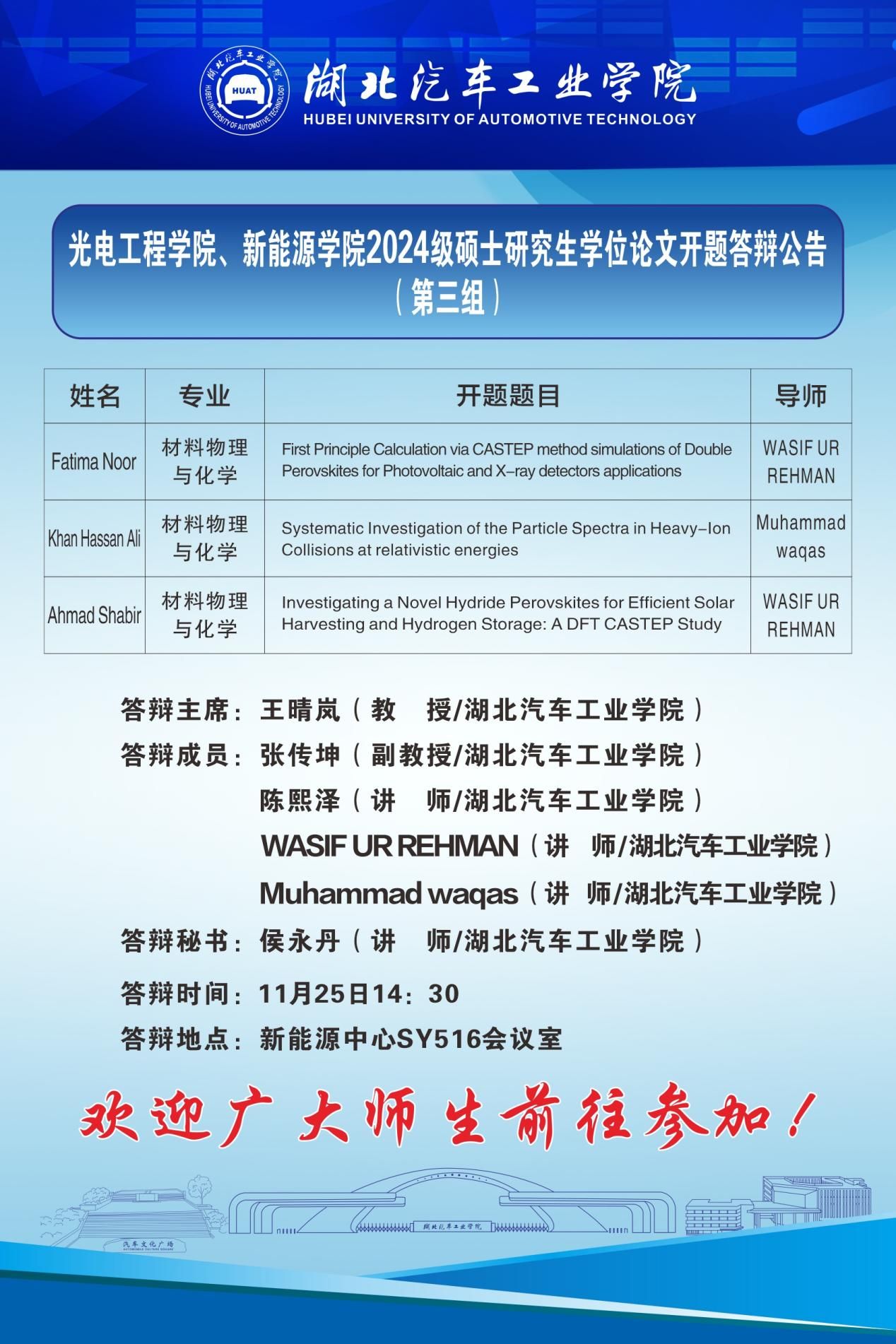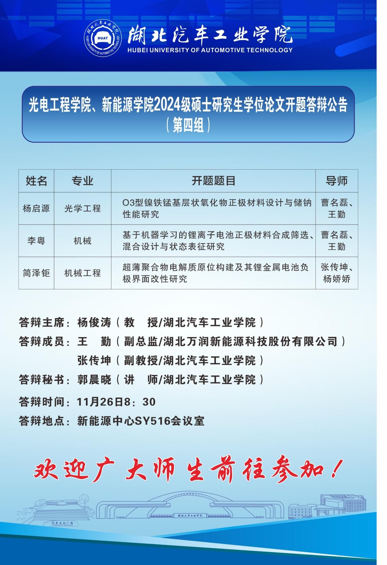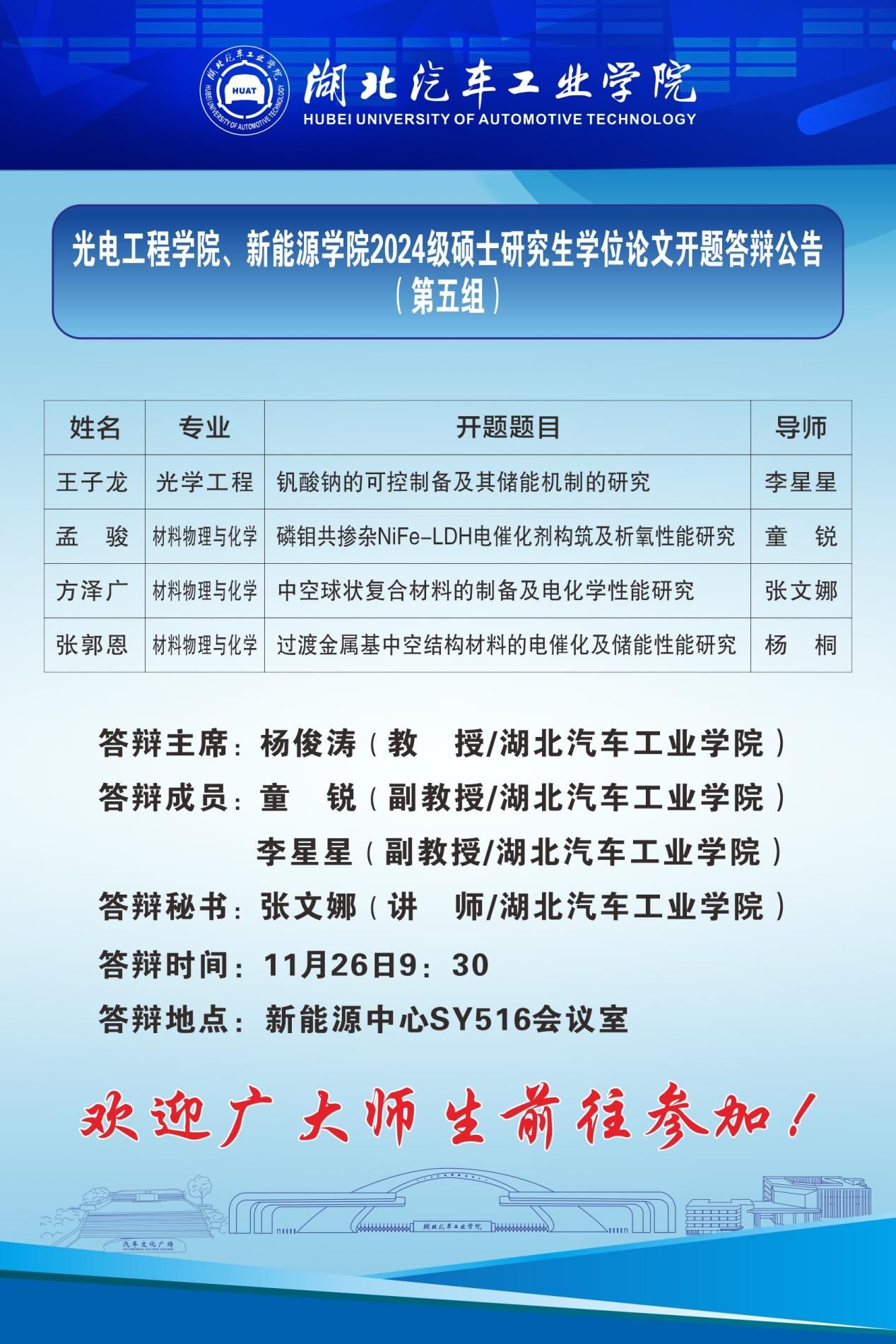 根据国务院学位委员会、教育部《关于进一步严格规范学位与研究生教育质量管理的若干意见》(学位[2020]19号)的要求,以及学校《关于做好2024级硕士研究生学位论文开题工作的通知》要求,结合《湖北汽车工业学院研究生学位论文开题报告管理办法》,现将新能源学院2024级硕士研究生学位论文开题答辩工作安排第三、四、五组公告如下: